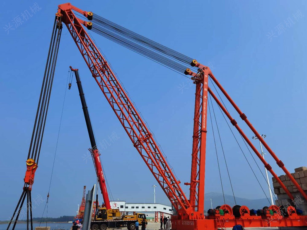 桅桿式起重機(jī)桅桿式起重機(jī),固定安裝的起重機(jī),一般用于港口碼頭桅桿式起重機(jī)又稱為拔桿或把桿,是最簡單的起重設(shè)備。一般用木材或鋼材制作。這類起重機(jī)具有制作簡單、裝拆方便,起重量大,受施工場地限制小的特點(diǎn)。 特別是吊裝大型構(gòu)件而又缺少大型起重機(jī)械時(shí),這類起重設(shè)備更顯它的優(yōu)越性。但這類起重機(jī)需設(shè)較多的纜風(fēng)繩,移動(dòng)困難。另外,其起重半徑小,靈活性差。因此,桅桿式起重機(jī)一般多用于構(gòu)件較重、吊裝工程比較集中、施工場地狹窄,而又缺乏其它合適的大型起重機(jī)械時(shí)。
