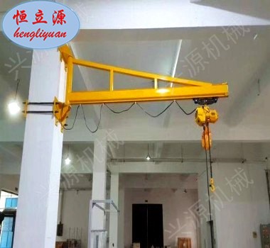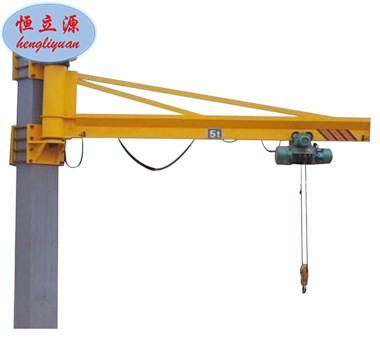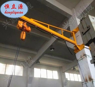 墻壁式旋臂起重機是根據(jù)用戶需要設(shè)計的專用起重設(shè)備。具有結(jié)構(gòu)新穎、合理、簡單、操作使用方便、回轉(zhuǎn)靈活、自重輕、載荷移動靈活等優(yōu)點,是節(jié)能的物料吊運裝備??蓮V泛利用于廠礦、車間的生產(chǎn)線、裝配線和機床的上下活及倉庫、碼頭等場合的重物吊運。墻壁式旋臂起重機(墻壁吊)由支架、旋臂裝置及環(huán)鏈電動葫蘆等組成。懸臂固定在墻壁或水泥柱上,可根據(jù)用戶需求進行回轉(zhuǎn)。回轉(zhuǎn)部分分為手動回轉(zhuǎn)和電動回轉(zhuǎn)。環(huán)鏈電動葫蘆安裝在懸臂軌道上,用于起吊重物。本機主要由:懸臂、回轉(zhuǎn)裝置、環(huán)鏈電動葫蘆組成。環(huán)鏈電動葫蘆有起重和在橫梁上往復(fù)運行的功能。懸臂梁可由回轉(zhuǎn)裝置上的的減速機帶動滾輪進行回轉(zhuǎn)運動。電器控制箱安裝在環(huán)鏈葫蘆上。本機操作通過手電門按鈕實現(xiàn)。手電門有八個按鈕,分別控制快升、快降、慢升、慢降、左右回轉(zhuǎn)及葫蘆小車的水平前后行走。